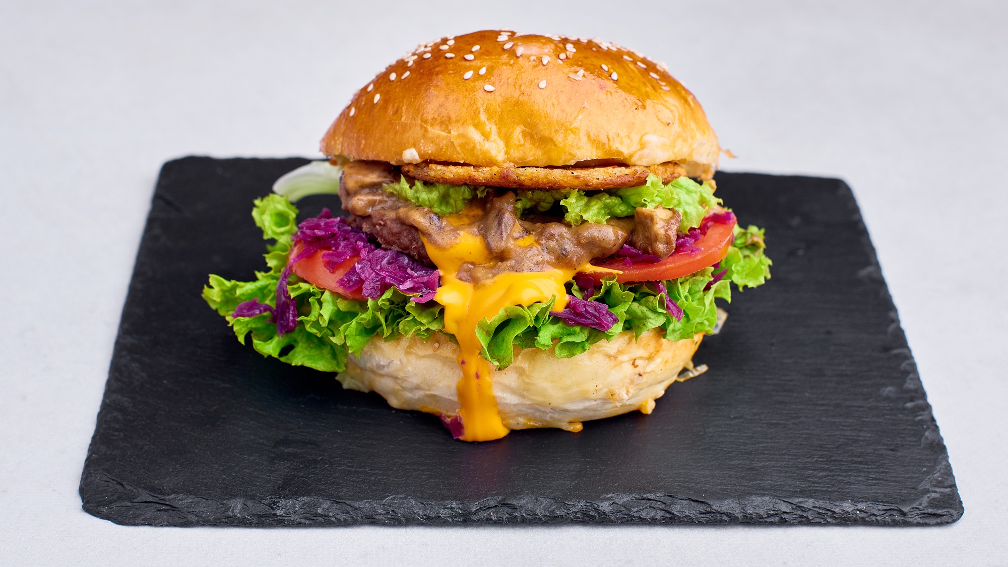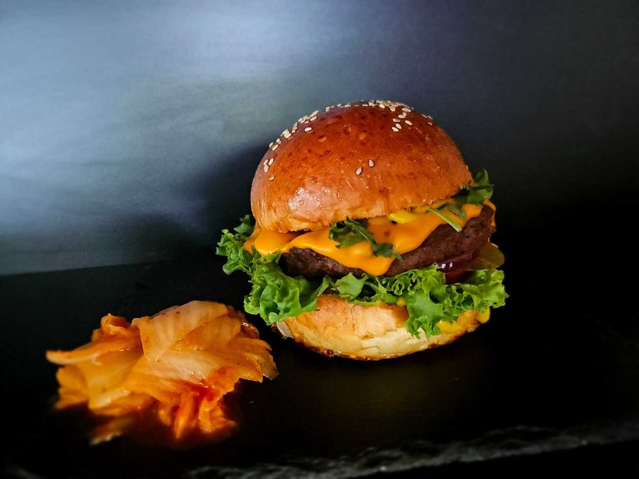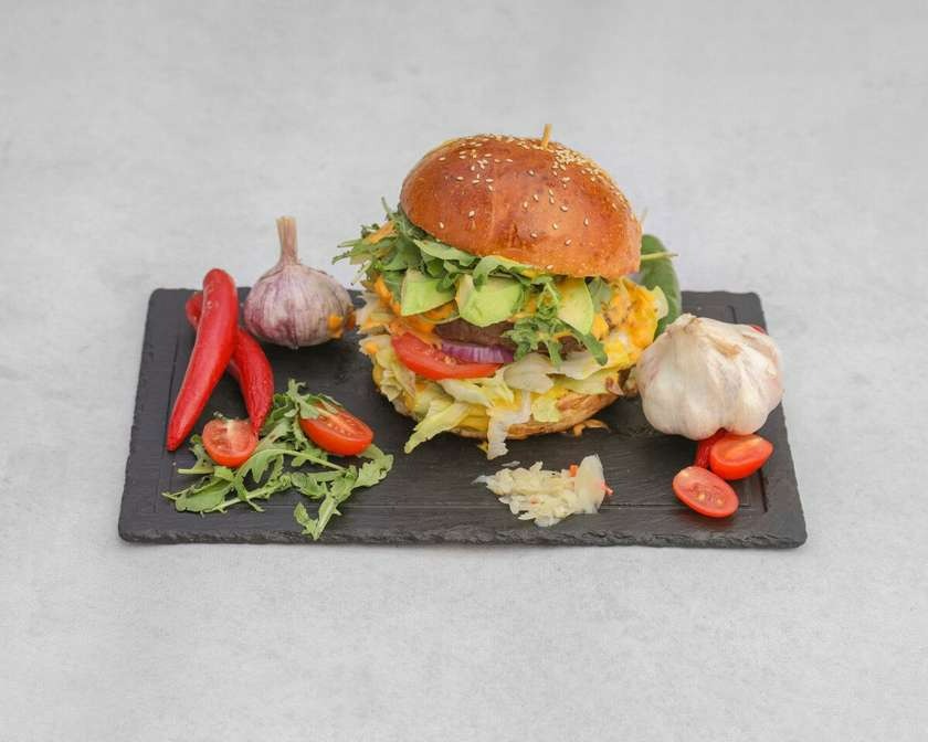 100g wołowiny, maślana bułka, ser, cebula, pomidor, ogórek piklowany, sałata, autorski sos burgerowy.