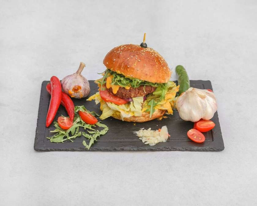 Kotlet z roślin strączkowych, maślana bułka, ser, cebula, pomidor, ogórek piklowany, sałata, sos burgerowy. W zestawie frytki i sałatka coleslaw. -